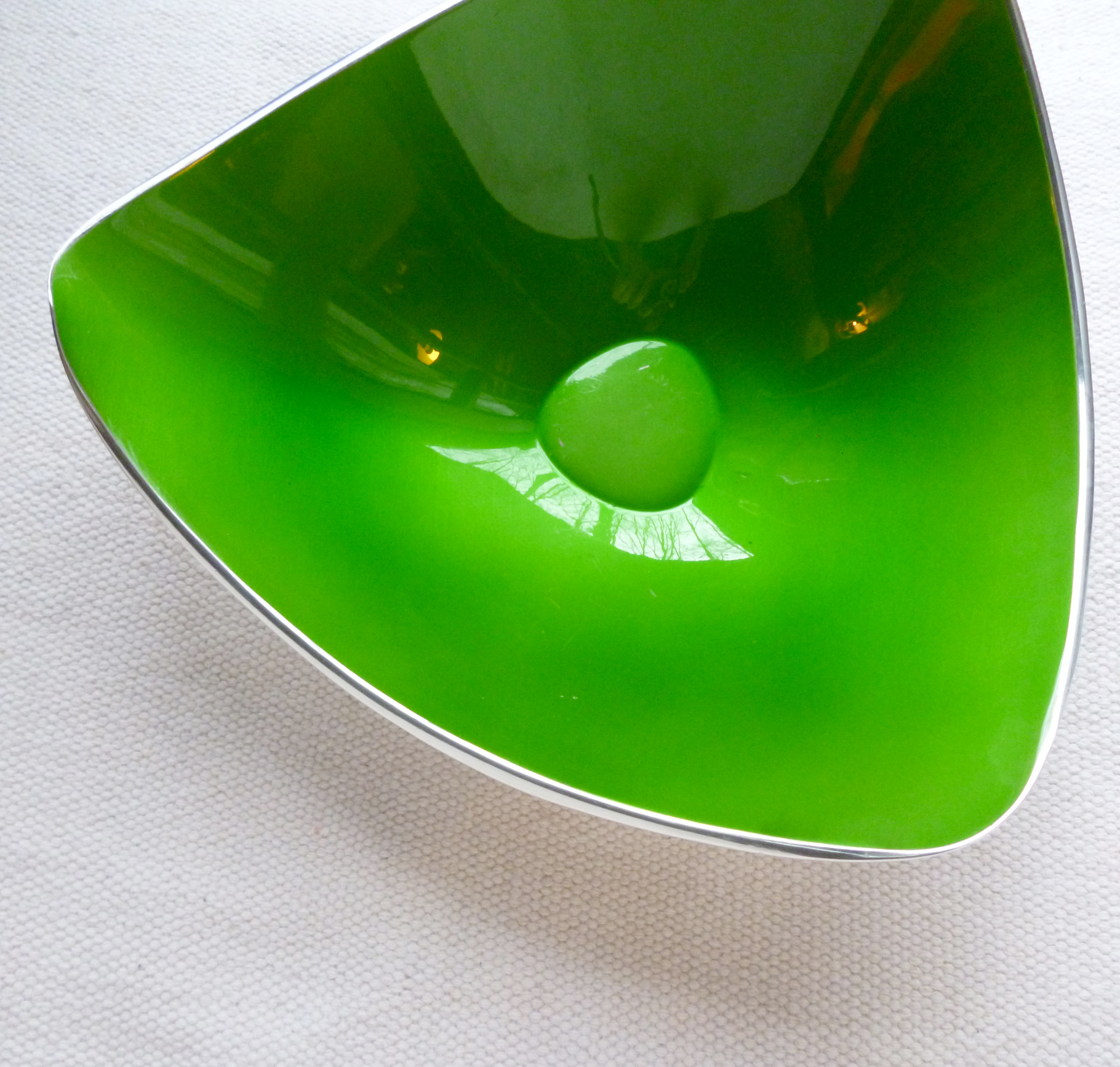 All of my treasures are a little difficult to let go on, which is why this beauty has been collecting dust on my shelf for for several years. Silverplated bowl with green enameled interior. Available on Etsy.